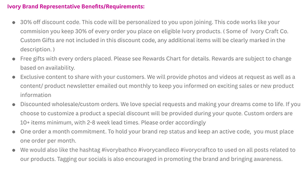 Join our bath/wax community by becoming one of our ivory brand representatives / influencers. Some perks include an exclusive discount on all bath products. Fun rewards and free gifts plus the opportunity to share our products with those you love! Please send us an email to ivorycraftco@gmail.com for more information! AND fill out this forum :